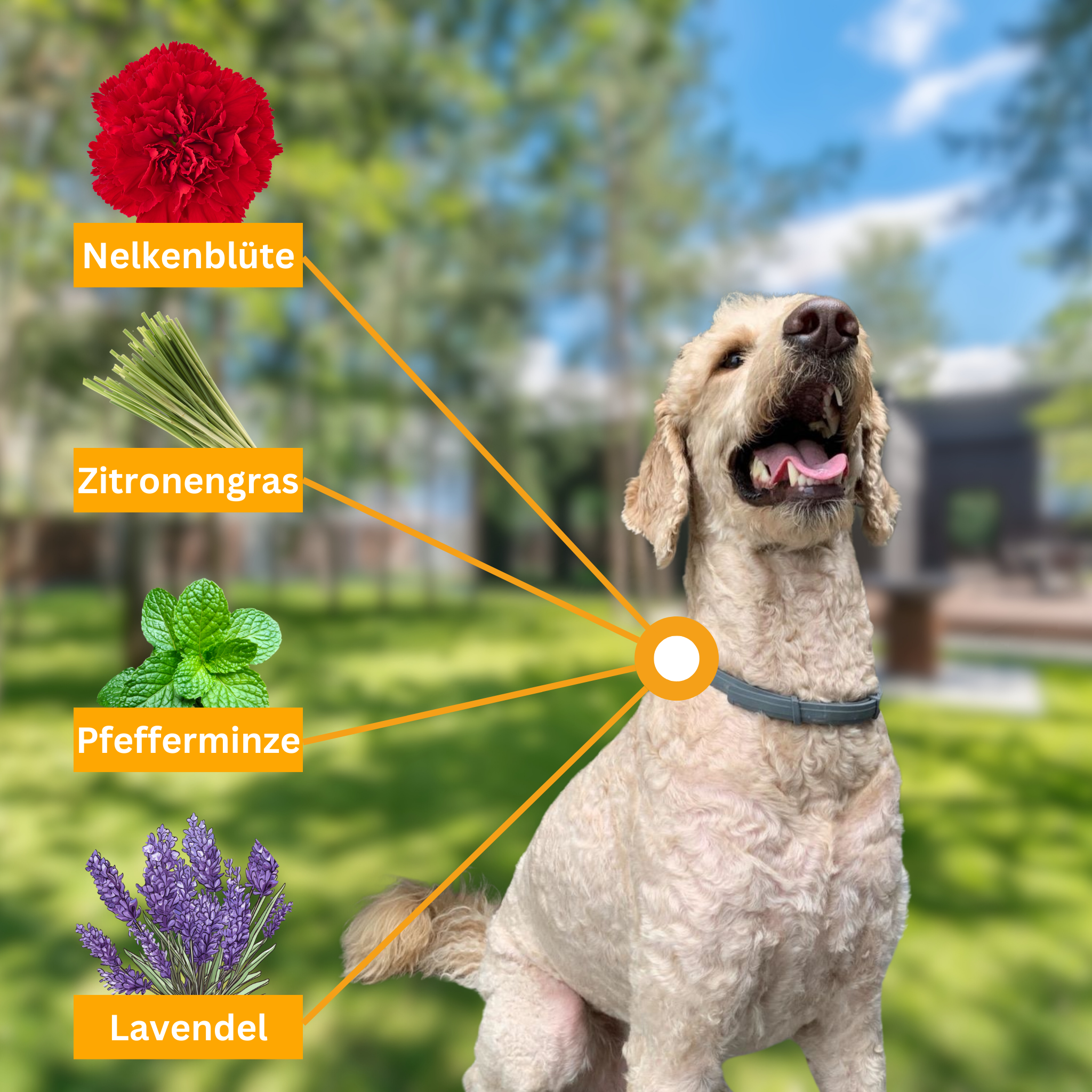 Unser Halsband enthält eine Mischung aus ätherischen Ölen – Lavendel, Pfefferminze, Zitronengras und Nelkenblüte – die Parasiten auf natürliche Weise abwehren.