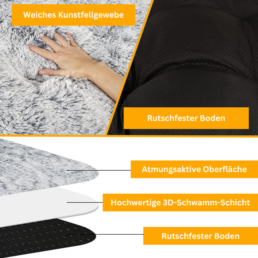 Das Orthocloud Hundebett besteht aus hautfreundlichem, doppelseitigem Plüsch und einem innovativen 3D-Schwamm.